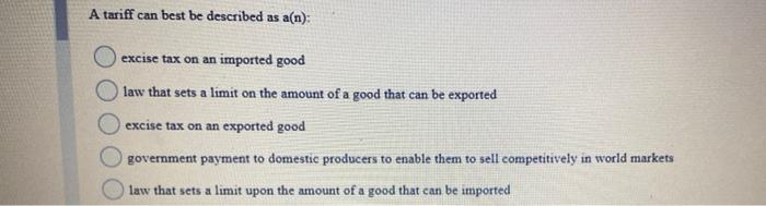 Jan 17 2021 Uncategorized Uncategorized. An excise tax on an imported good B. A law that sets a limited upon the amount of a good that can be imported. A law which sets a limit on the amount of a good which can be imported. A government payment to domestic producers to enable them to sell competitively in world markets. Put simply a tariff is a specific tax levied on an imported good at the border. A government payment to domestic producers to enable them to sell competitively in world markets. A law that sets a limit on the amount of a good that can be imported. A tariff can BEST be described as which of the following.