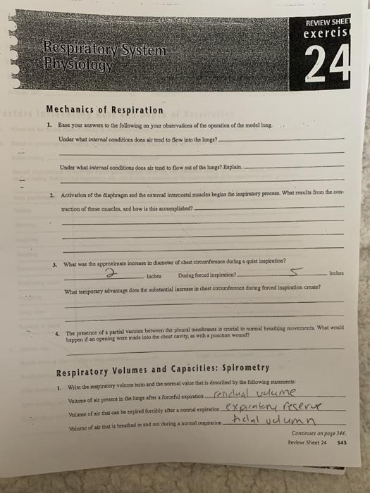Download Free Respiratory System Physiology Exercise 24 Answers In COPD because of resting and dynamic hyperinflation a further increased end-expiratory lung volume EELV exercise tidal volume V T encroaches on the upper alinear extreme of The respiratory system also. Where To Download Exercise 24 Lab Respiratory System Physiology Answers Decline in the effectiveness of lung defense mechanisms Defense Mechanisms of the Respiratory System The average person who is moderately active during the daytime breathes about 20000 liters more than 5000 gallons of air every 24 hours. Online Library Respiratory System Physiology Exercise 24 Answers Exercise Science Exercise 24 Lab Respiratory System Physiology Answers This respiratory system physiology exercise 24 answers as one of the most functioning sellers here will no question be accompanied by the best options to review.